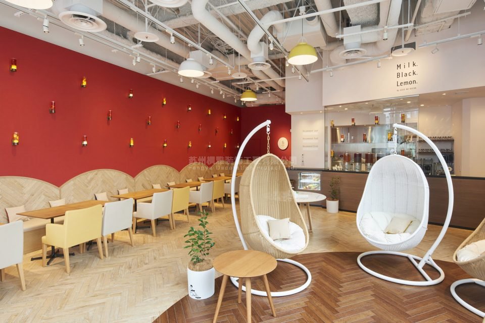地板选用了红茶与奶茶的颜色,座椅则是奶茶和柠檬茶的颜色
