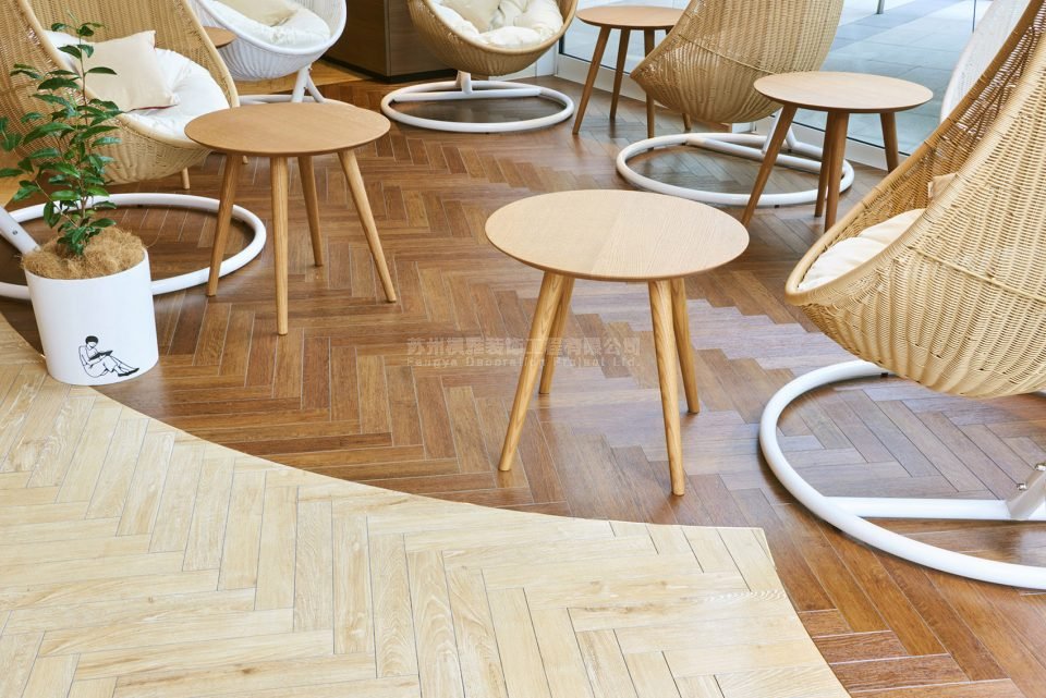 经典人字形纹样地板选用了红茶与奶茶的颜色。盆栽中种植着茶树,装有皮质软垫的座椅则是奶茶和柠檬茶的颜色,其它的家具和装饰也同样使用了以茶为灵感的色调