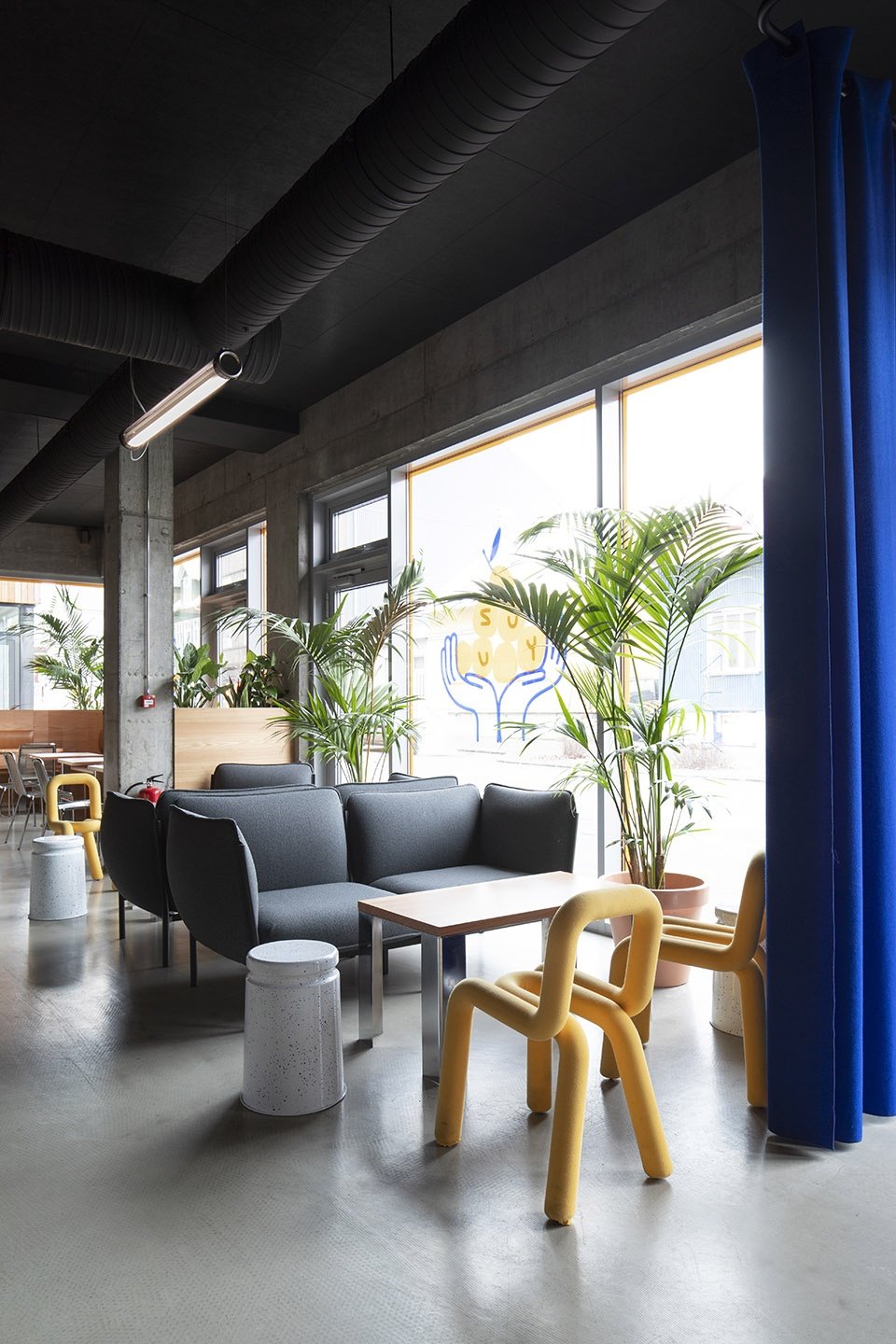 餐厅采用开放式布局,所有的用餐空间都围绕着厨房布置。透过厨房的黄色玻璃,顾客们可以看到厨师们忙碌的身影。天蓝色的羊毛窗帘可以根据需求将餐厅划分为数个较小的空间单元。