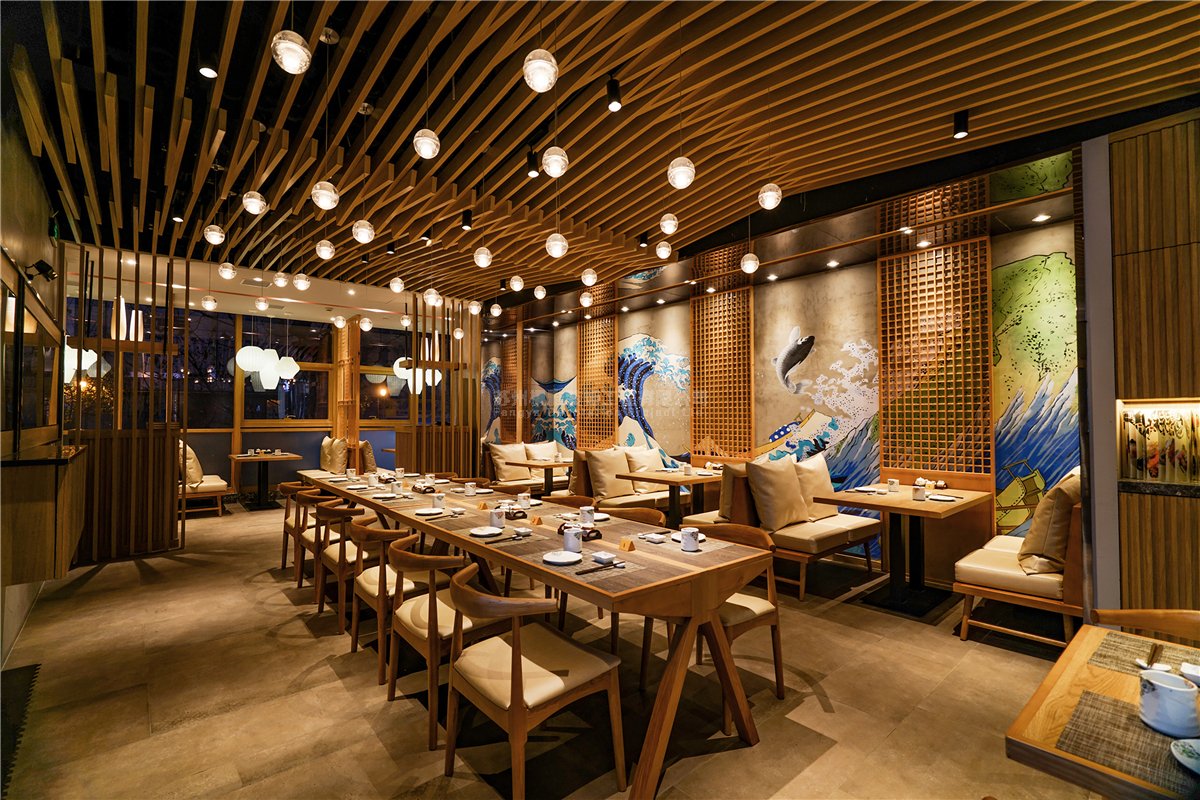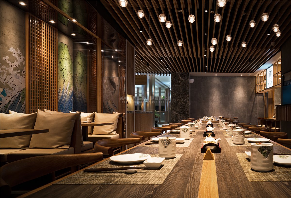 项目简介:传统的日式料理,更多是以日本自古以来的情愁、冷艳为主色调,木制的颜色让整个环境充满古色古香的感觉,天花板上挂着的灯散发出暖黄色的灯光,显得更有格调