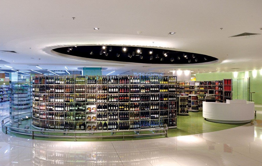 椭圆形玻璃展柜,与流线型的吊顶相呼应,加上柔美的光纤,给消费者一种悠闲、舒适的感受。生活超市给消费者带来的是在超市的繁杂以外的方便、安全与舒适。