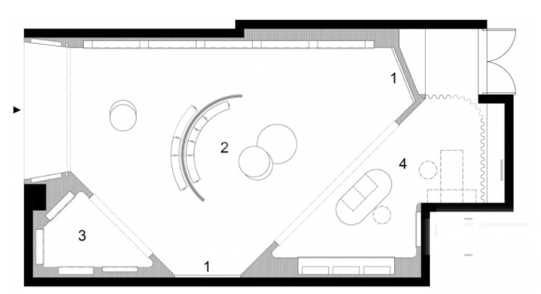 项目介绍:眼镜店内部空间概览,中间设置橙黄色渐变的曲面玻璃隔断,在店铺朝外的两个角落放置大镜子,眼镜店室内,在长方形场地里放入一个三角形的空间。