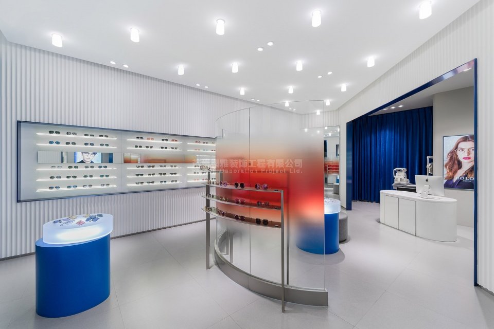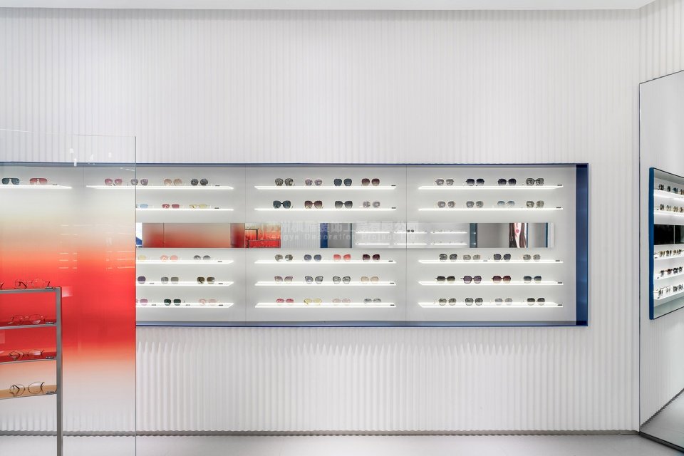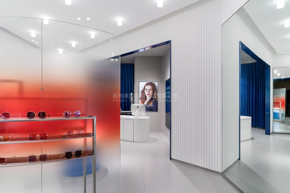 眼镜店室内,玻璃隔断的曲面造型导引了顾客购物流线,眼镜店室内局部,墙面展示架由蓝色不锈钢组成,与曲面玻璃的橙色形成对比。