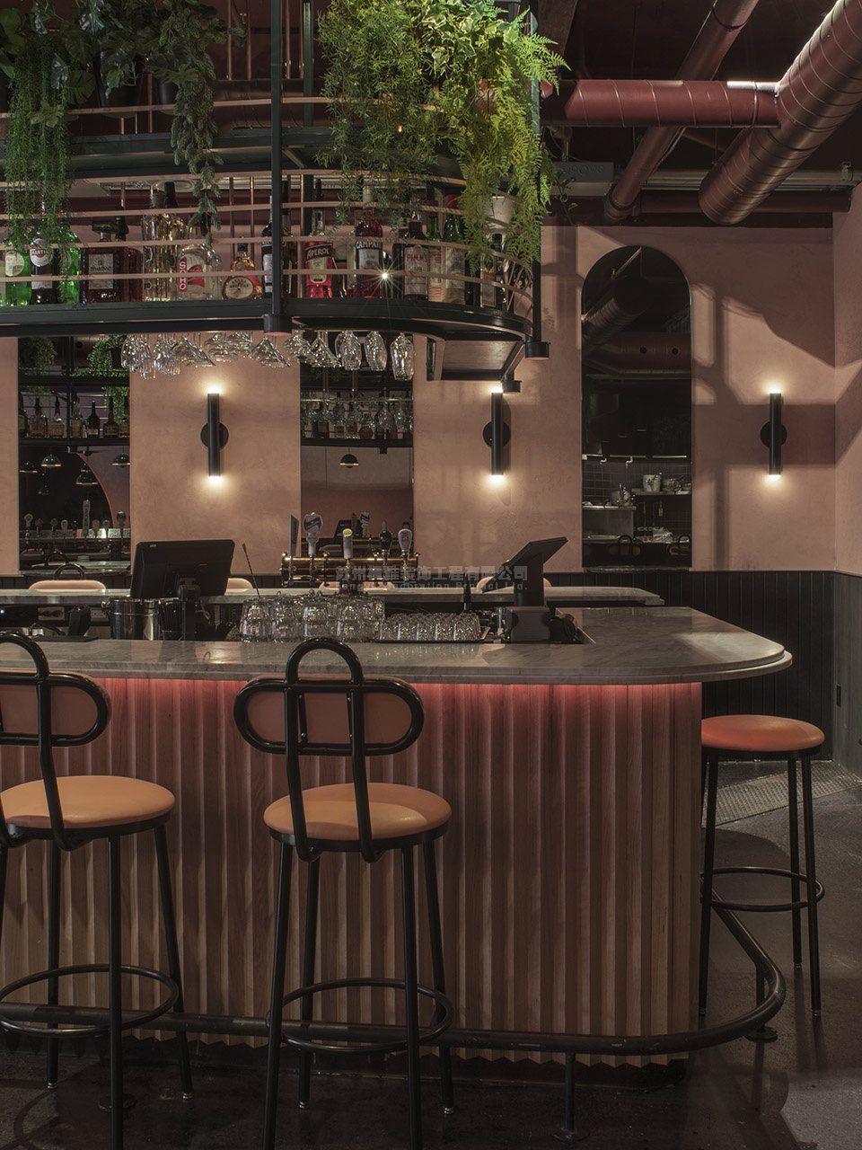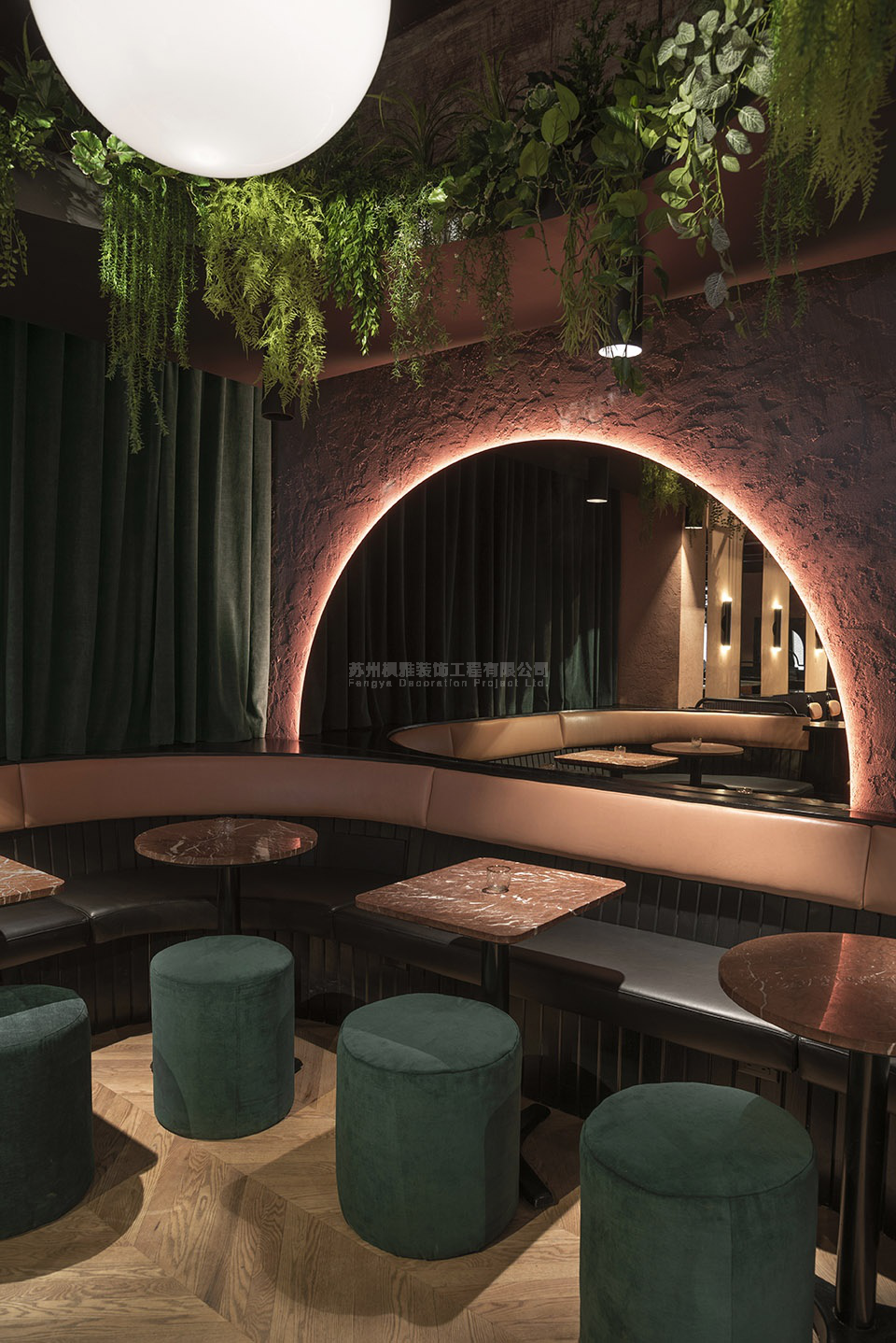 设计师初步构思是设计一个热带主题的餐厅。业主希望内部装饰能够带来一种非常温暖的氛围,脱离所在的环境。餐厅氛围通过不同的纹理、颜色和空间中使用的大量植物来营造。空间围绕着中央酒吧布置,分隔成不同的饮食区域。这种布局方式吸引顾客在晚上用餐时到处走动,从不同的角度探索空间。
