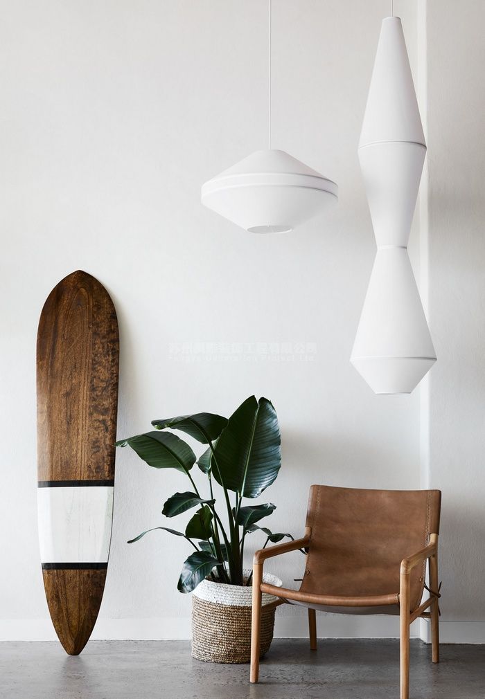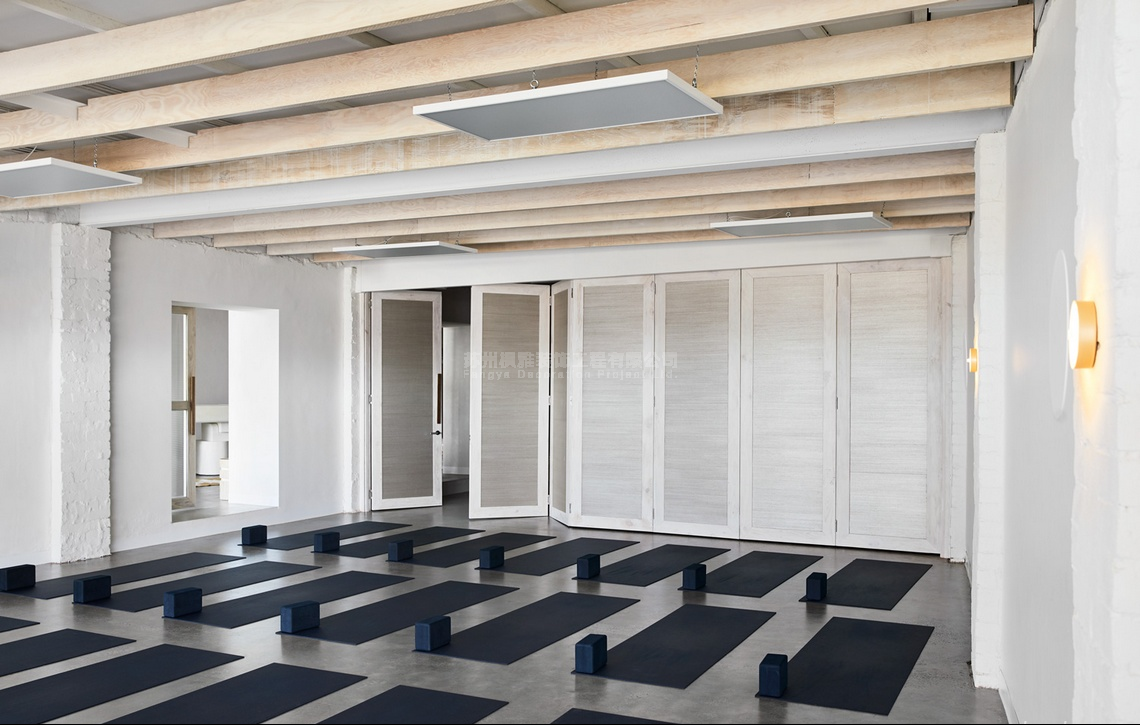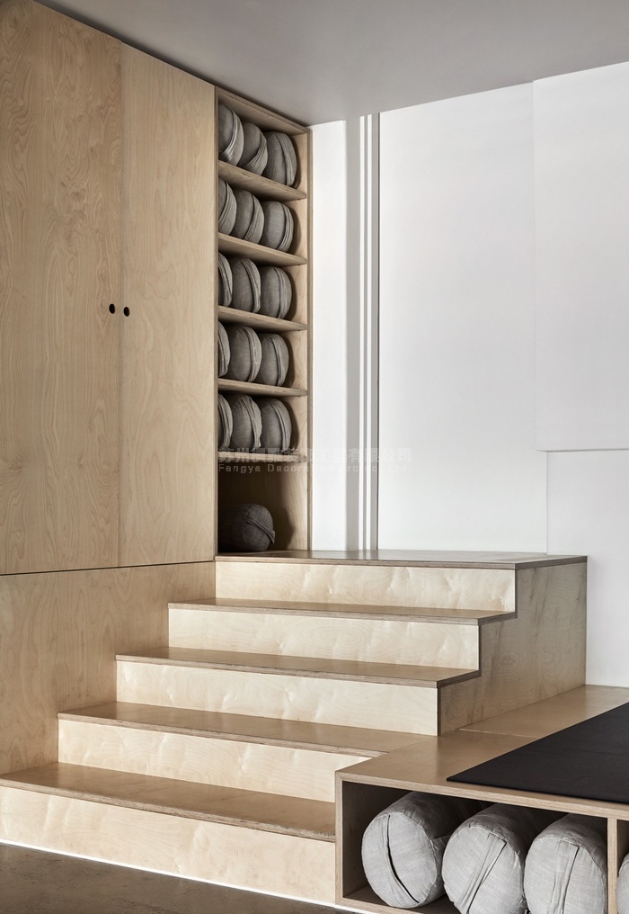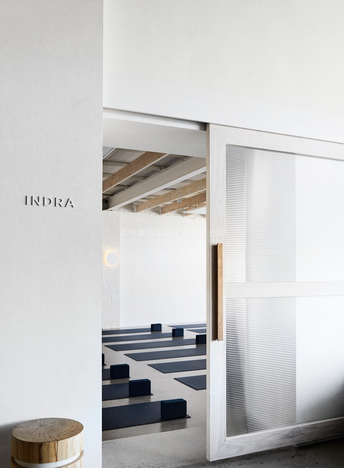 瑜伽室大面积玻璃门的设计过滤了阳光,定制的双折门让空间可以随意组合,天花木梁的造型创造了微妙的平衡,同时巧妙地隐藏设备。手工纹理的墙壁增强了原始和有机的感觉,造就了鼓舞人心的空间。