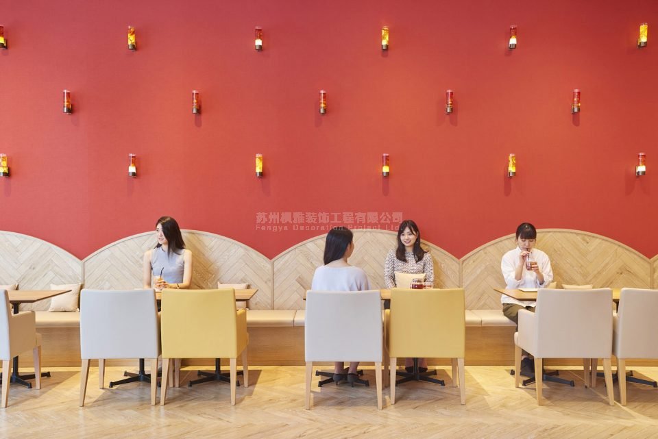 座位区和服务区上方的茶灯细致地再现了茶屋中提供的各类红茶饮料,整间茶屋完全被丰富的茶色照亮。茶屋中的所有事物皆是为了提供全新的、轻松惬意的饮茶体验。
