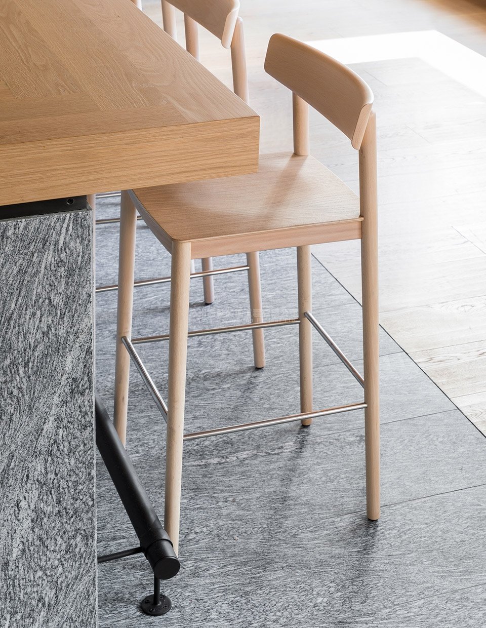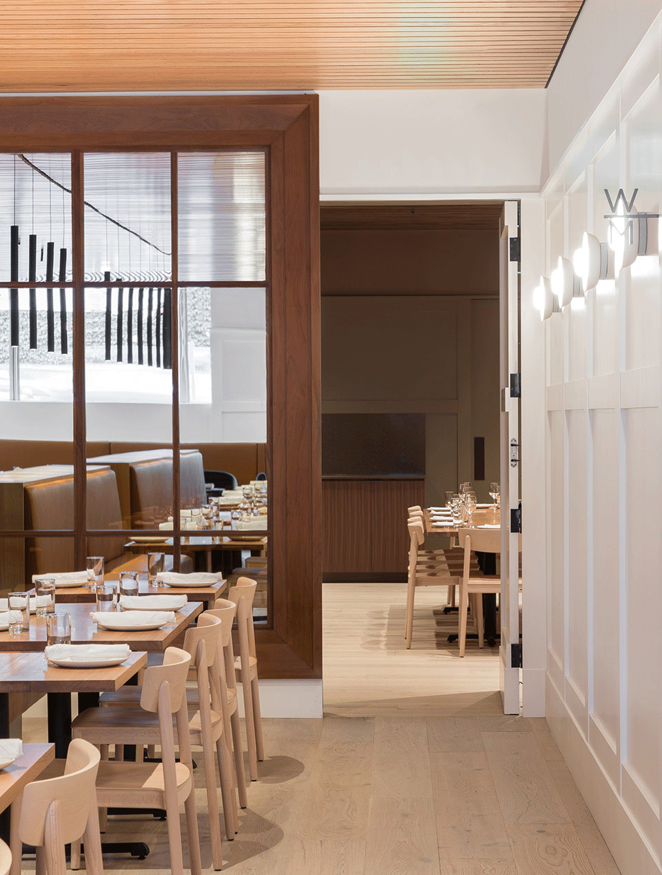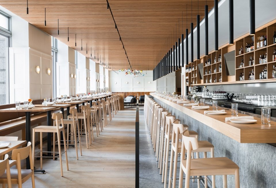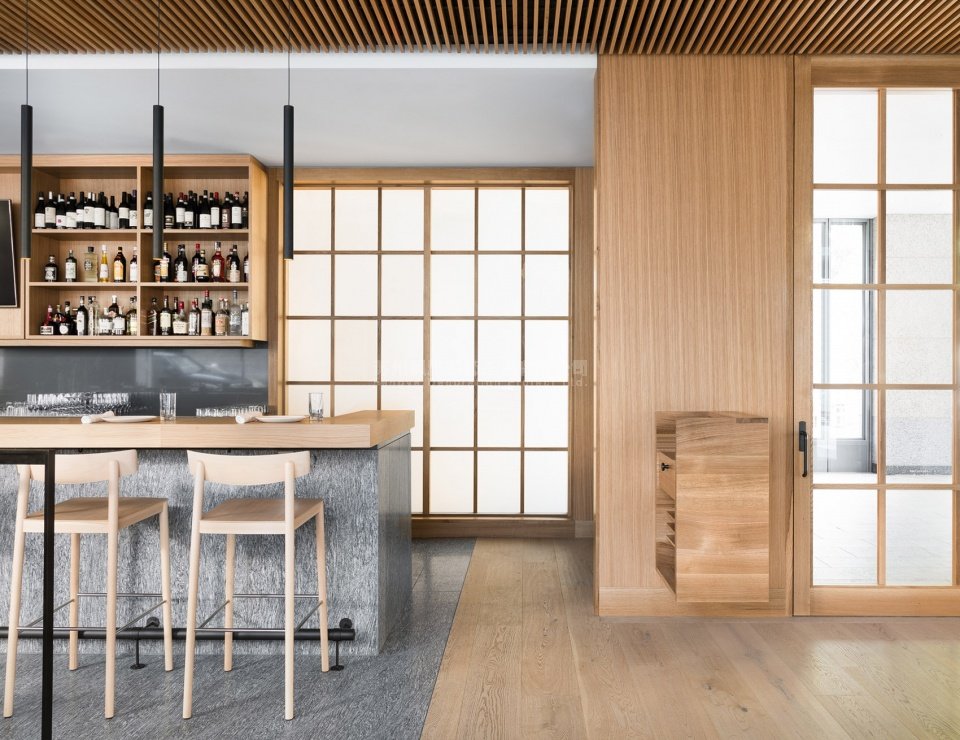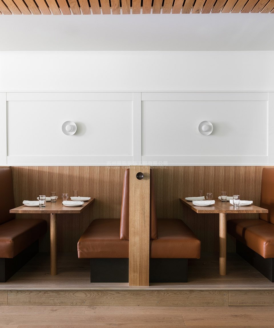 餐厅在细节的处理上较为简单,但施工标准却很高,力求表现出天然材料的固有美感和饰面上的光影变化。本案通过重复出现的形式和家具,在丰富狭长空间的同时建立起一种音乐节奏般的韵律感,从而为人们提供了一个理想的用餐场所。