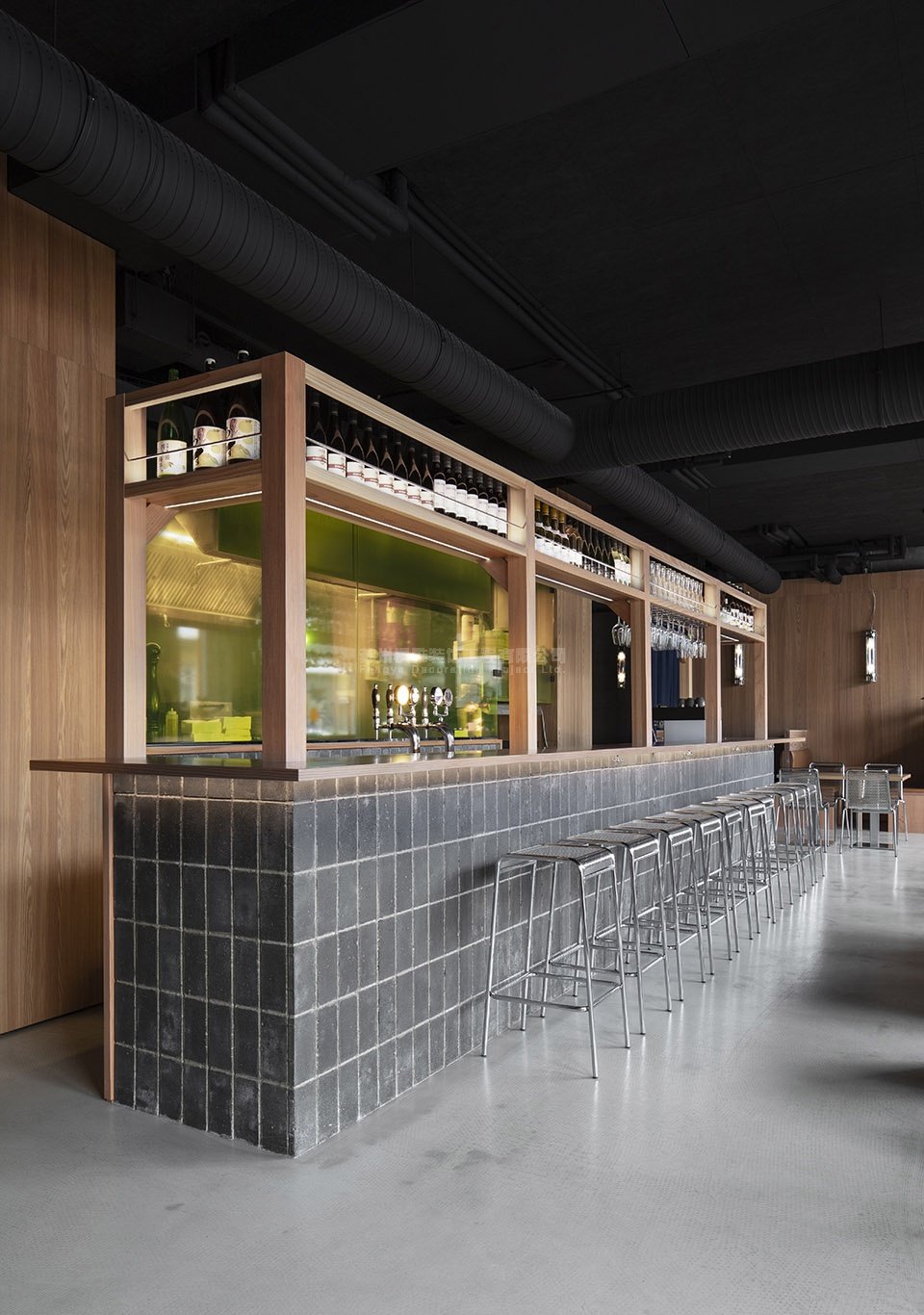 项目简介:该餐厅面积为220平方米,在材料上选择了混凝土砖、黄色玻璃、天蓝色的窗帘、铬钢、道格拉斯冷杉和棕色的皮革座椅等。