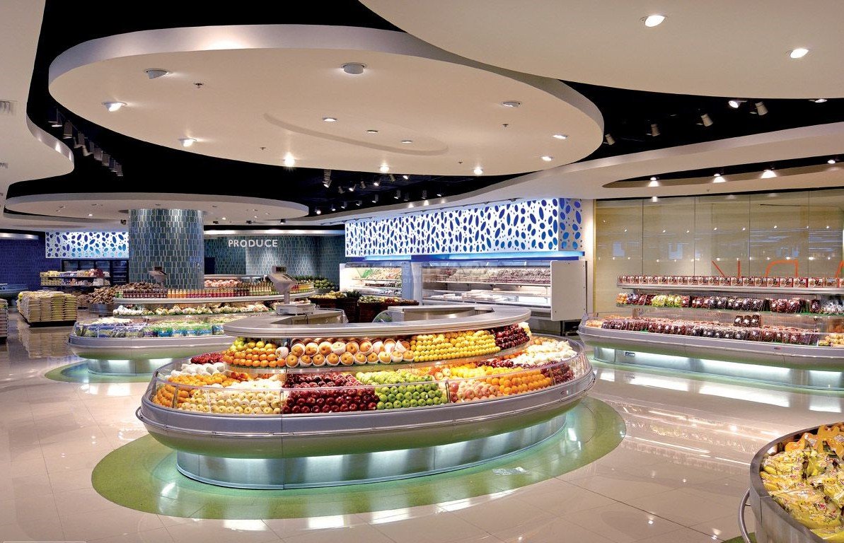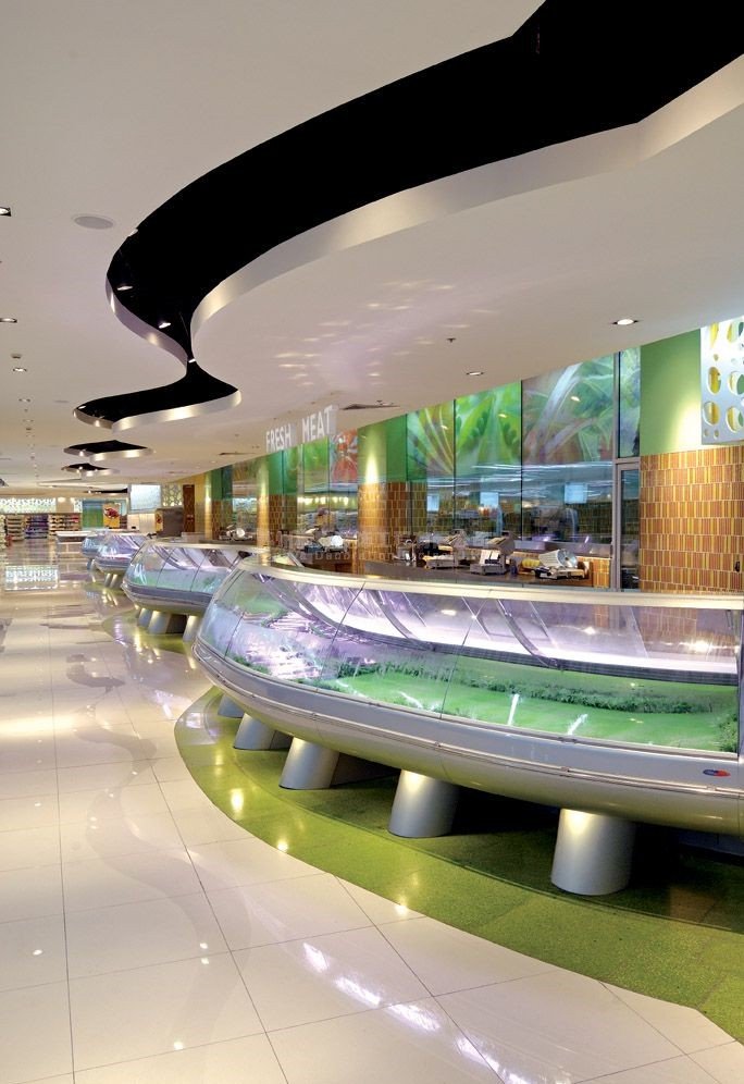 椭圆形玻璃展柜,与流线型的吊顶相呼应,加上柔美的光纤,给消费者一种悠闲、舒适的感受。生活超市给消费者带来的是在超市的繁杂以外的方便、安全与舒适。