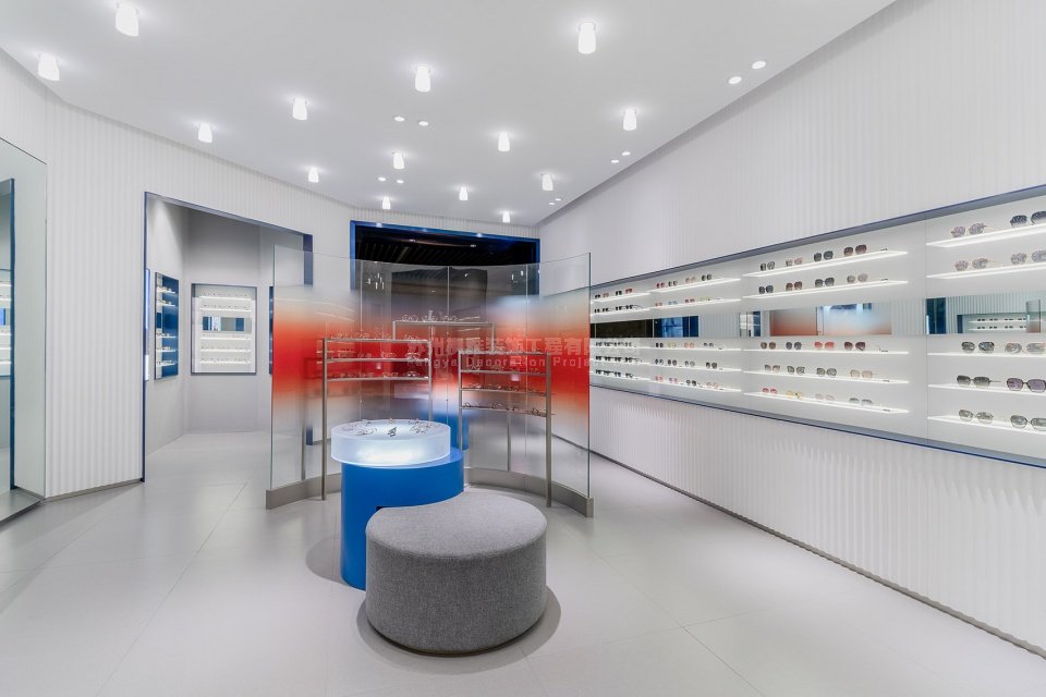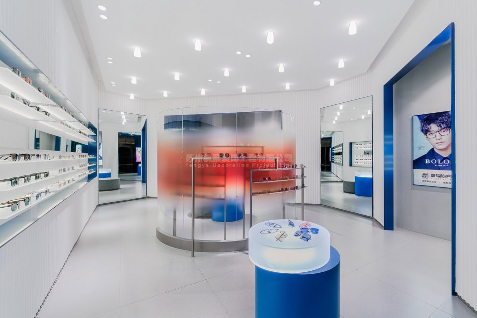 眼镜店室内,玻璃隔断的曲面造型导引了顾客购物流线,眼镜店室内局部,墙面展示架由蓝色不锈钢组成,与曲面玻璃的橙色形成对比。