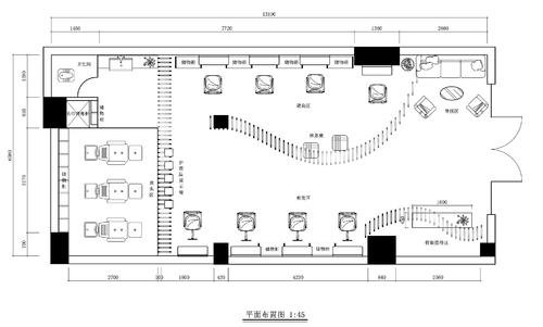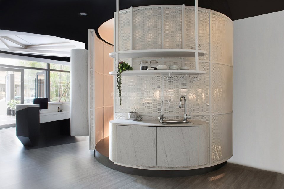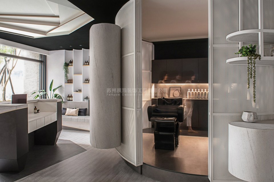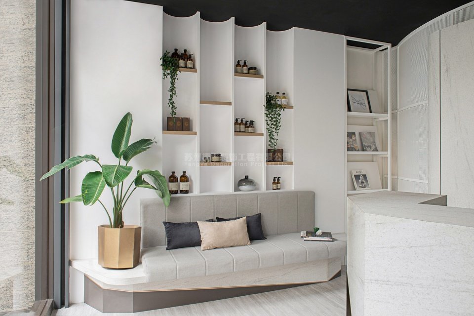 发廊入口处的沙发区,采用黑白灰的配色和弧形的展示空间。造型天花板的丰富层次是花朵简化后的线条,花瓣的有机交叠呼之欲出。