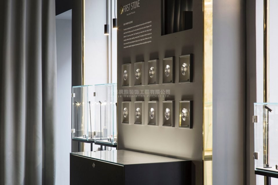 项目介绍:店主希望顾客不仅可以在此购买到珠宝,还能够在浏览展品的过程中学到更多的琥珀知识和选购经验。为了实现这一目标,设计师精心设计了一系列室内装饰部件,包括可以播放专用视频的一体化荧屏,定制的室内展示牌,以及专为展示琥珀及其他珠宝的橱窗展示架。