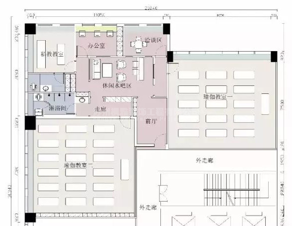 在其他方面,客用设施和更衣室进一步营造了宁静的休闲之所。温暖的胡桃木饰面储物柜用于存放个人物品,而定制沙发床以供学员休息和放松。