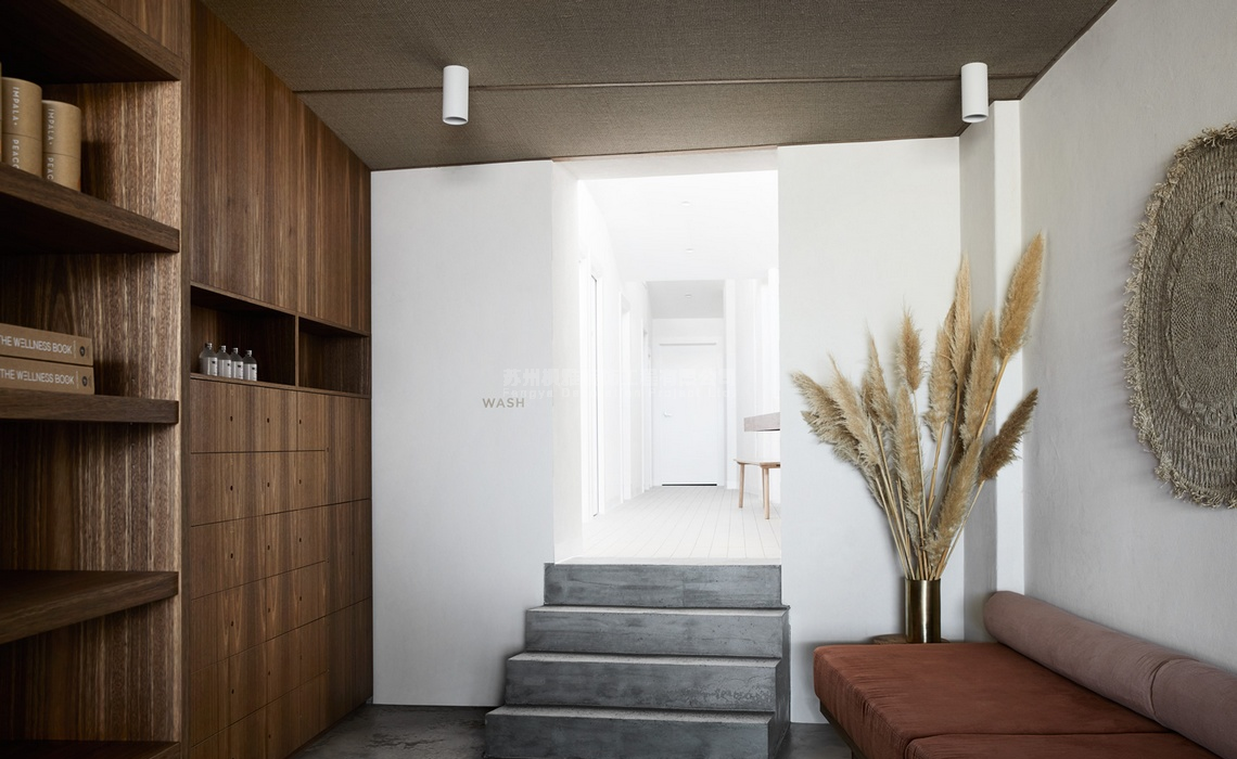 瑜伽室大面积玻璃门的设计过滤了阳光,定制的双折门让空间可以随意组合,天花木梁的造型创造了微妙的平衡,同时巧妙地隐藏设备。手工纹理的墙壁增强了原始和有机的感觉,造就了鼓舞人心的空间。